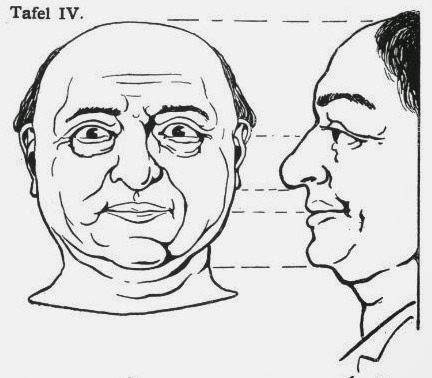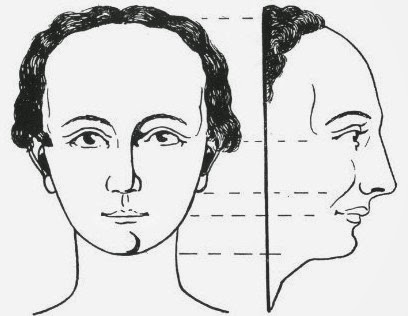 - Hauptmasse des Gesichts liegt unterhalb der Verbindungslinie zwischen Ohrloch und Nasenwurzel